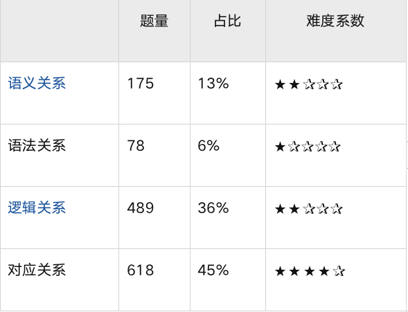 通过这个表格大家就会发现,类比推理的难点就在考察对应关系的题目难度系数较高,而且题量占比接近一半。