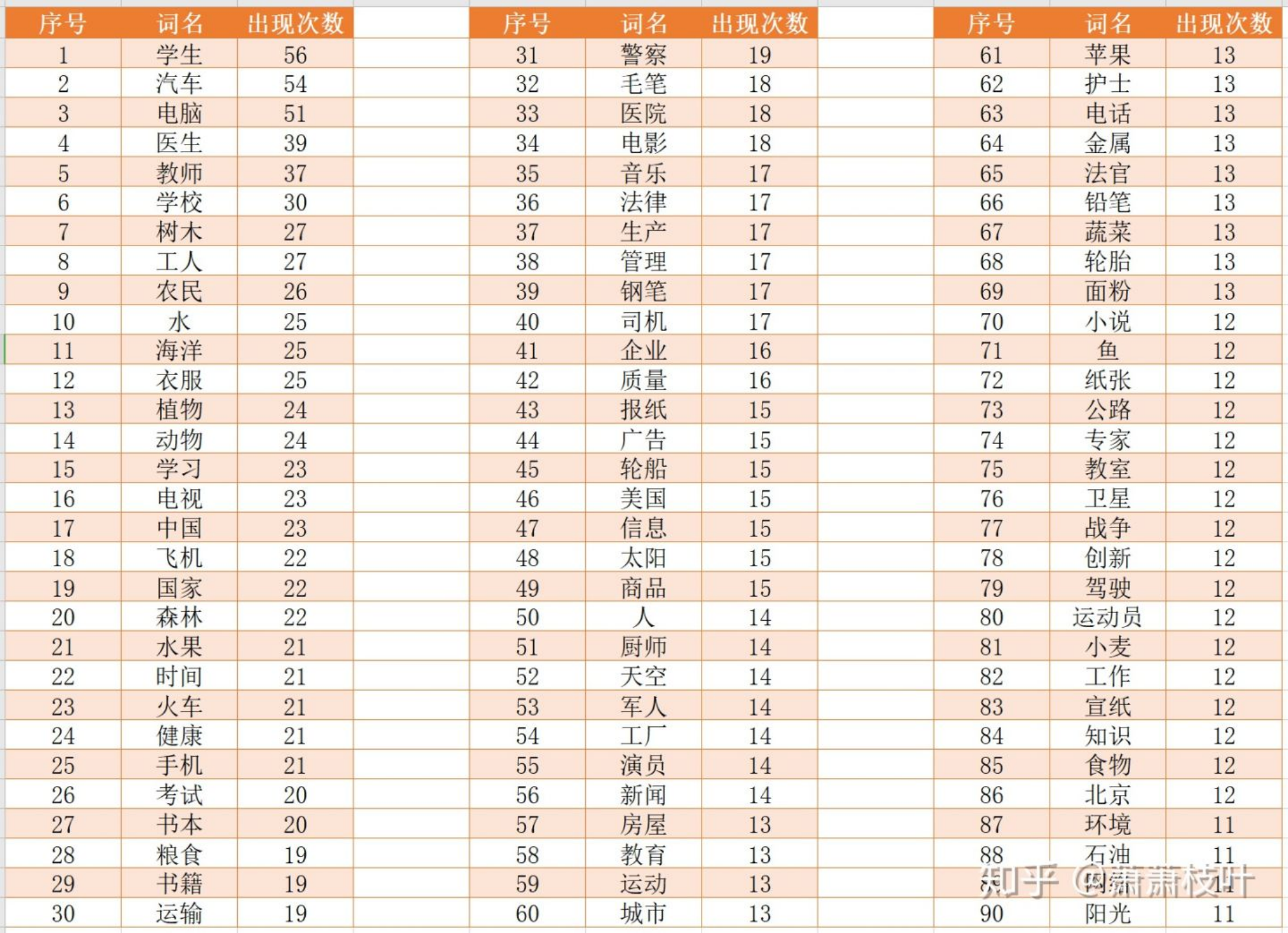 另外,经常有同学会问我,能不能出一个类似于《逻辑填空高频词汇》的《类比推理高频词汇》?答案是没必要。 为了满足大家的好奇心,我还是花时间做了统计,下图为出现频率前 90 的词语情况。