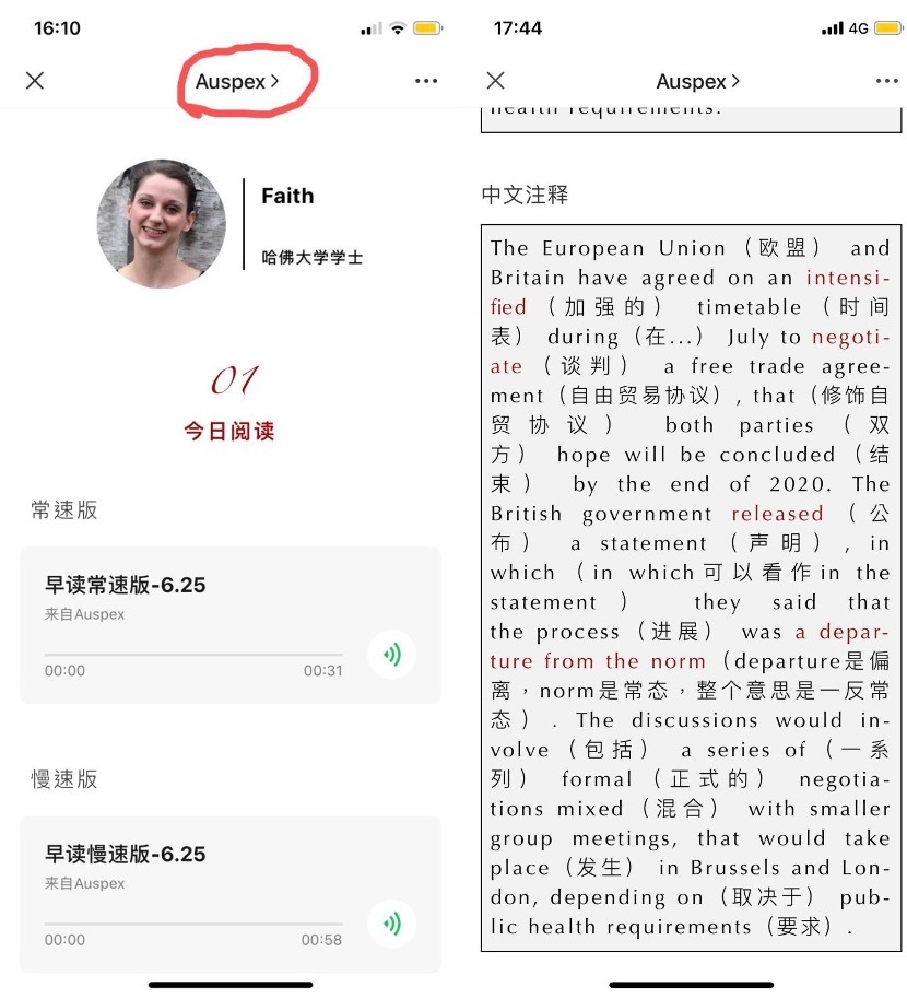 哈佛老师 Faith 每周在 Auspex 更新 BBC,VOA 等外刊短文,有常速朗读版和慢速朗读版,慢速版朗读比 VOA 慢速还要慢,非常适合大家做听力练习。