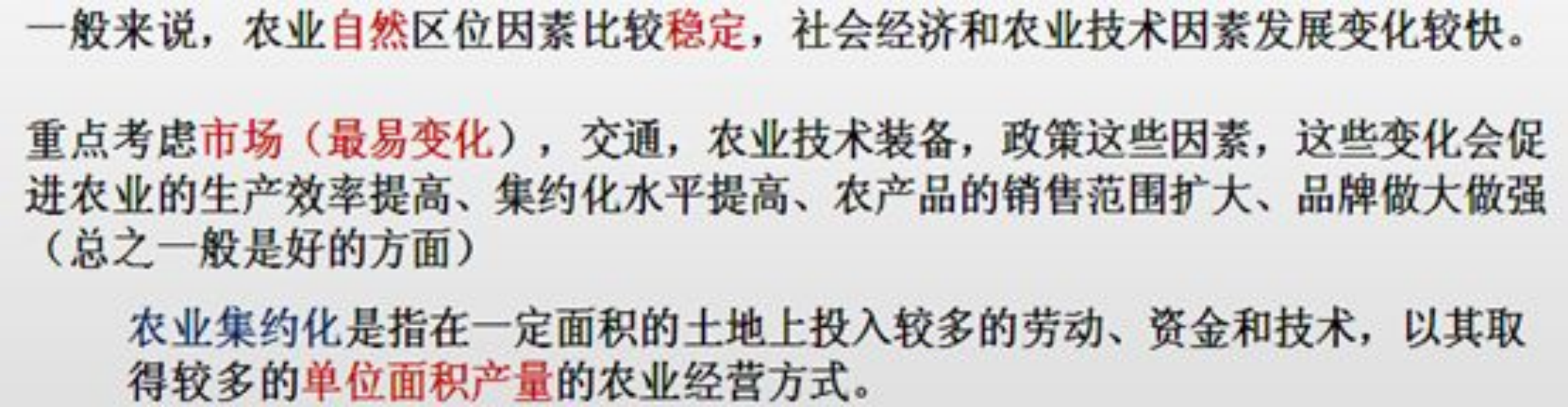 集约型农业——通过在单位土地增加劳动力、资金、技术来增加单产。