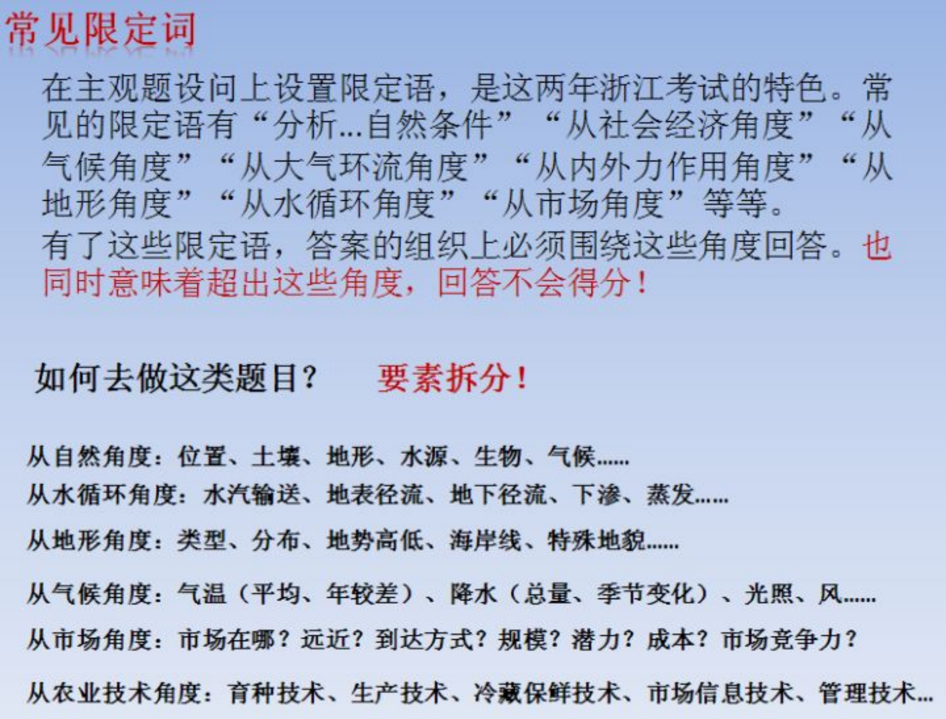 我们要在考前看教材,把教材中提到的重要地理概念、地理过程找出来,用自己的话说出来,检验一下自己到底掌握到了什么程度。