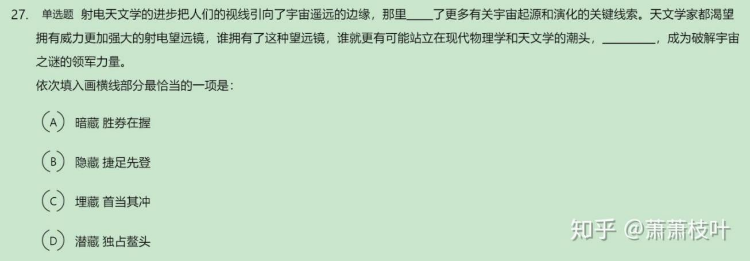 第二个空的逻辑提示是后面的「成为…领军力量」,强调的是领先的状态,可以迅速排除 A 和 C。 剩下「捷足先登」和「独占鳌头」都有领先的意思,但是仔细分辨会发现,「独占鳌头」的词义侧重于独自占领首位、获得第一,但「领军力量」只是强调领先,根据文意,任何国家拥有射电望远镜都能成为领军力量,领军力量指的是很多的领先者,而非仅有一个第一名。 所以应当选「捷足先登」,侧重于领先。