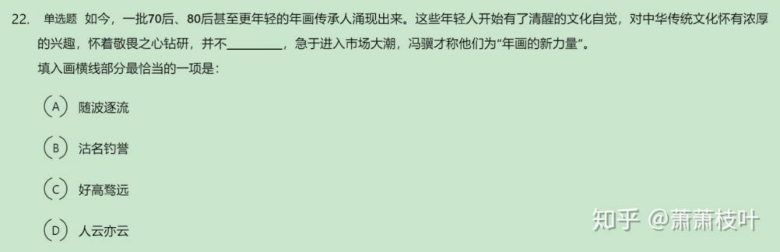 剩下的两项「随波逐流」和「人云亦云」都有缺乏主见的意思,能够和「急于进入市场大潮」构成对应,当时我想的是,「大潮」与「随波逐流」形象更为贴切,所以选 A。