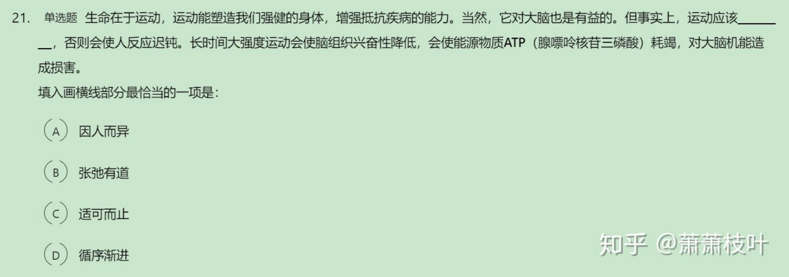 「因人而异」和「循序渐进」和文段关系不大,排除。 剩下的「张弛有道」和「适可而止」中,「张弛有道」的对立面是过张或过弛,而「长时间大强度运动」仅指「过张」一方面,两面对一面,排除。 而适可而止的对立面是不停止,和「长时间大强度运动」相符,故选 C。
