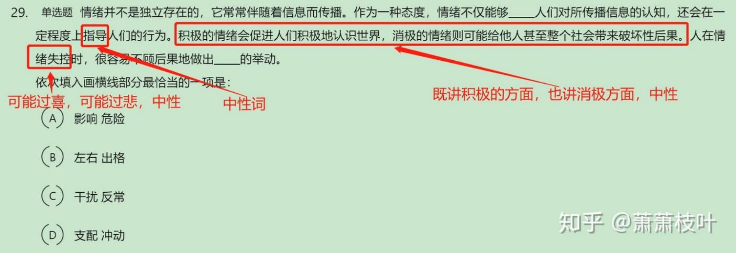 从空格处的感情色彩入手,很容易理解,就是通过逻辑提示和文段主旨得出空格处应该填褒义、贬义还是中性词。 前文的例 3(2018 国考 29 题)已经体现了这一点。
