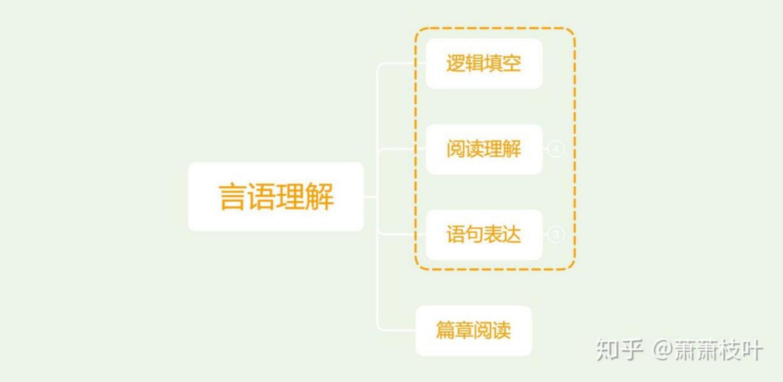 言语理解分为逻辑填空、阅读理解、语句表达、篇章阅读四部分题型,但因为篇章阅读主要是由前面三类题型组合而成的大材料题(1 个材料对应 5 个问题),所以实际上言语理解是包含三大类题型。