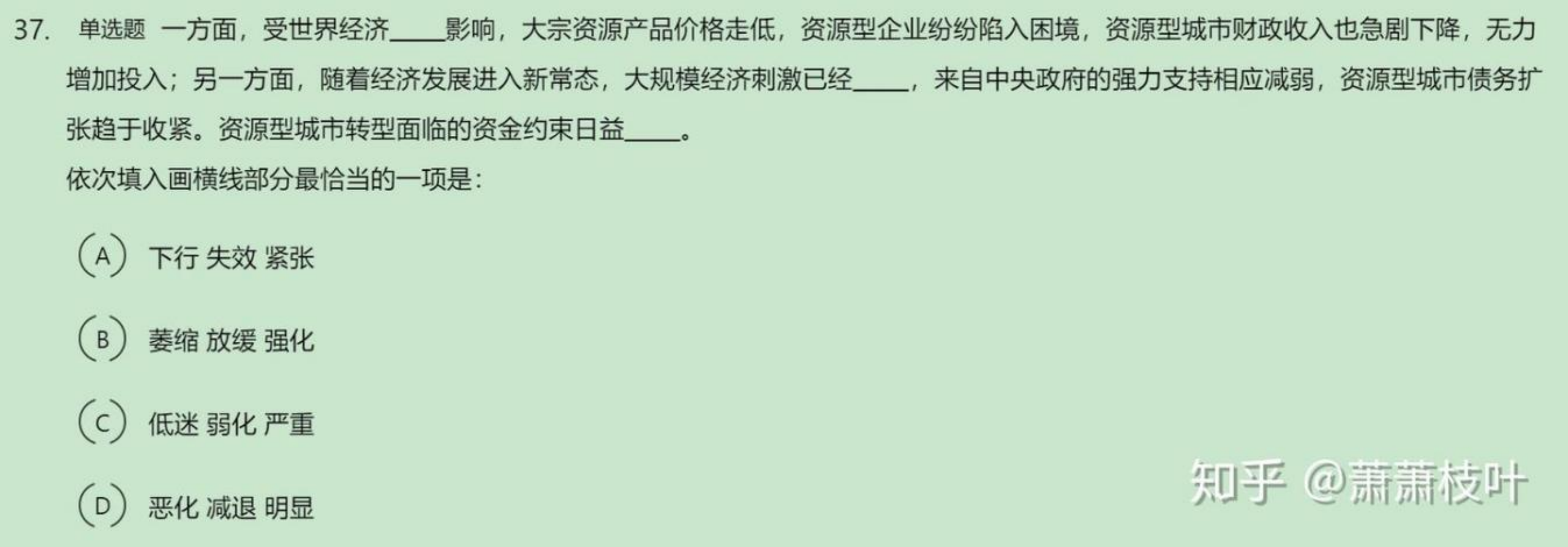 首先看第一个空,此处表达经济不好的状况,四个选项均可搭配。 再看第二个空,「放缓」指速度放慢,与「刺激」无法搭配,排除 B。 「刺激」「减退」,也没有这种表达习惯,搭配不当,排除 D 项。