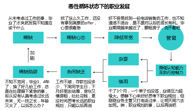 稀缺陷阱的根源在于对资源的错误利用,从而出现了实际的短缺。 因此,要想从根本上解决贫穷的问题,只需要一个办法:重新分配自己的带宽资源,在带宽充裕时及早将重要的事纳入你的考虑范围,为未来的选择创造足够的余闲,这样即使面对危机,你也能够游刃有余,拥有足够自由的选择权,不会再被「杂耍」和「借用」推着走,这样你的职业发展才会步入良性循环。