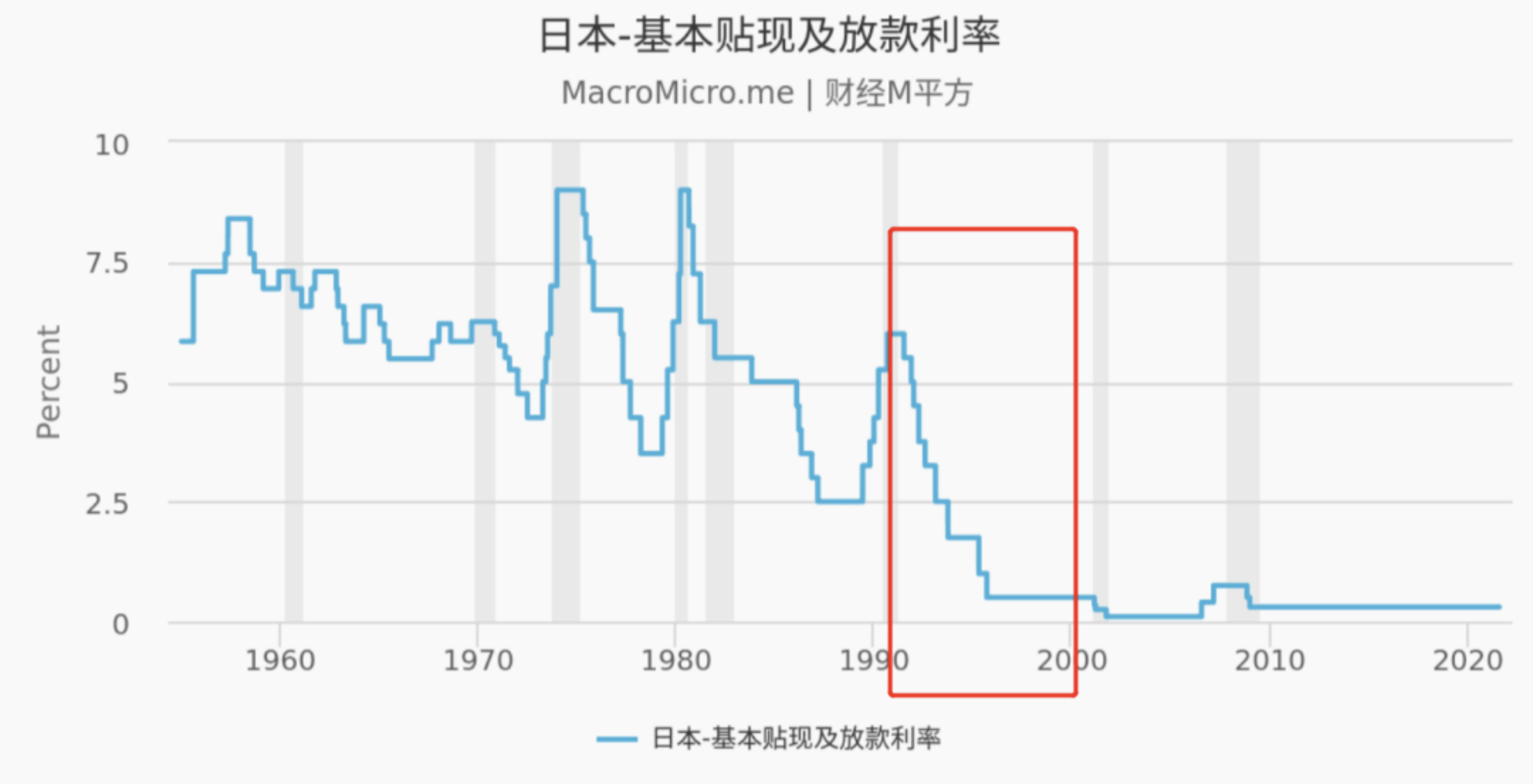 日本经济泡沫破裂之后,日本政府立即实施了宽松的货币政策进行逆周期调节,利率不断下调,从 1991 年的 6%,下降至 1996 年的 0.5%。