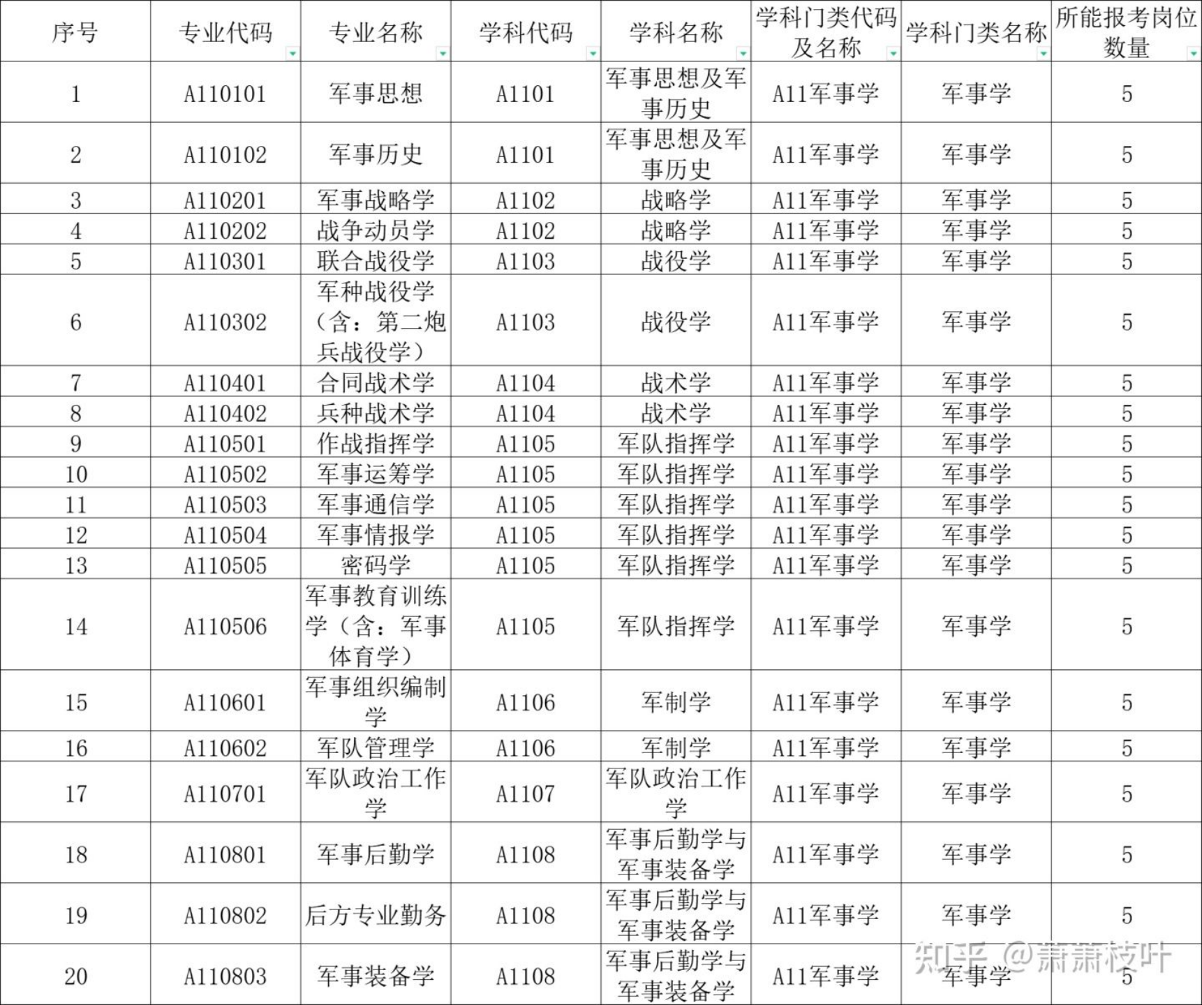 从排名倒数 20 名的情况来看,军事学门类下的专业的岗位选择范围比较窄。